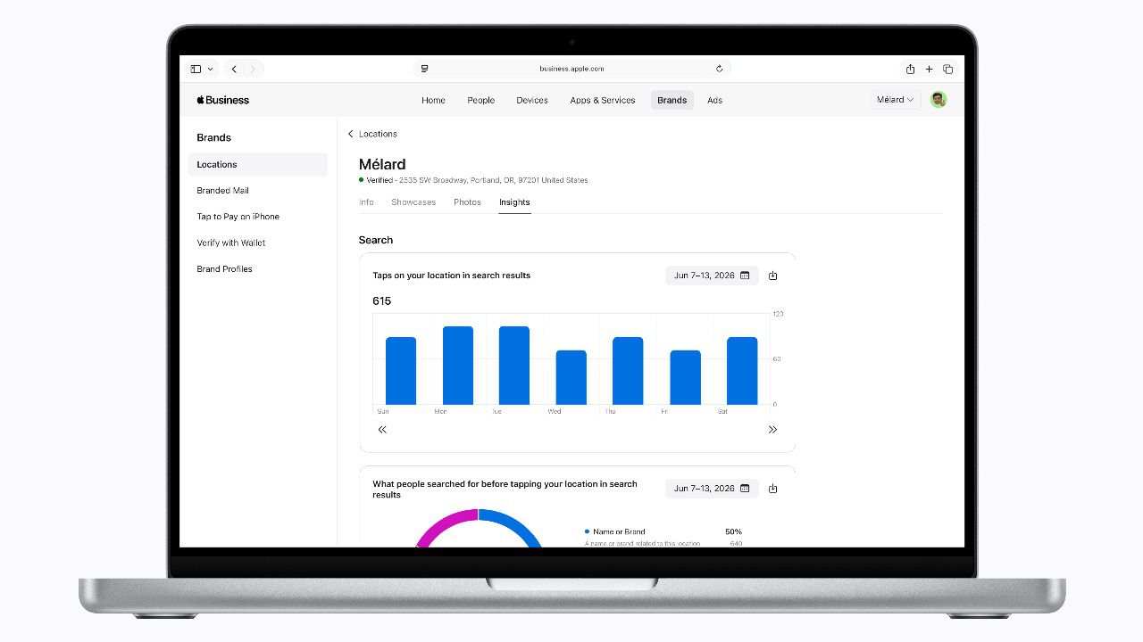 Otro de los elementos diferenciales de Apple Business es la integración de herramientas de gestión de marca y localización. Las empresas pueden controlar cómo aparecen sus perfiles en servicios como Mapas de Apple, Mail, Cartera o Siri, pudiendo gestionar información corporativa, añadir contenidos visuales, destacar ofertas y habilitar acciones como compras o reservas desde las fichas de ubicación. Además, ofrece estadísticas sobre interacción de usuarios, lo que aporta datos relevantes para la toma de decisiones.
