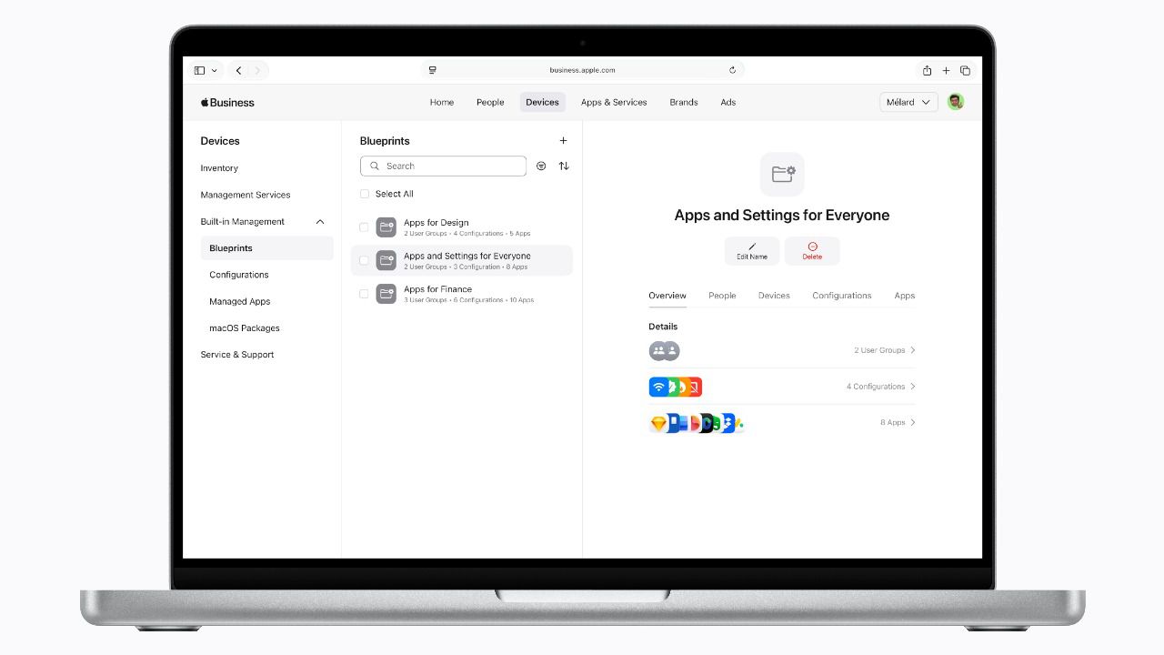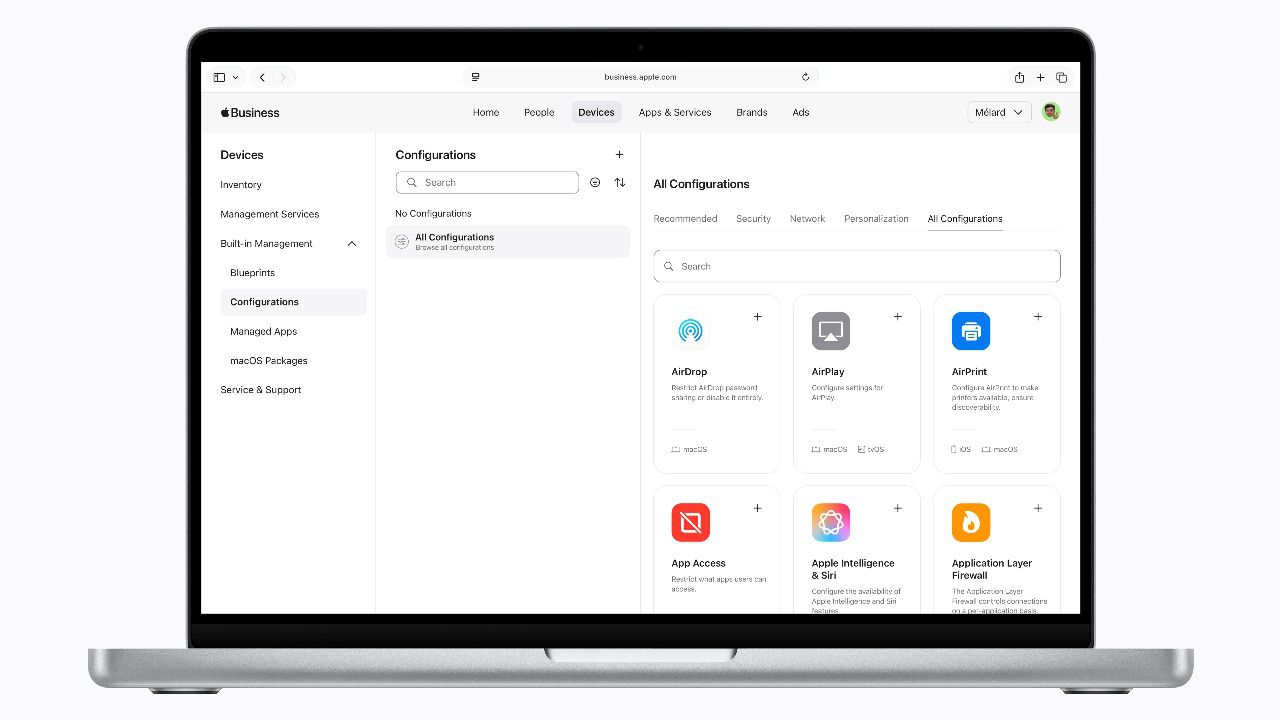 Uno de los pilares de Apple Business es la gestión integrada de dispositivos móviles. La plataforma permite a las organizaciones supervisar y configurar todos sus equipos desde una interfaz unificada, lo que simplifica tareas operativas y mejora el control sobre la infraestructura.