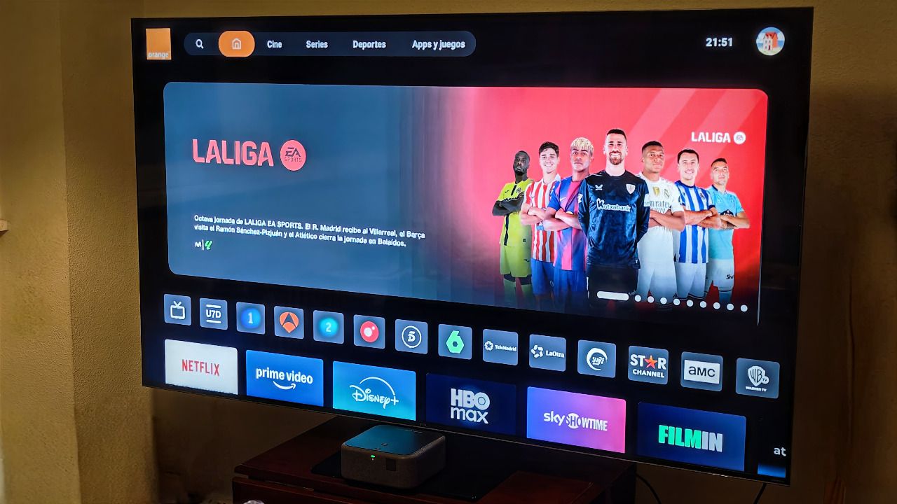 Orange ha apostado por un concepto de agregador de contenidos, donde todo se mezcla en la misma pantalla. El planteamiento tiene sentido, pero le falta algo de precisión: las sugerencias no siempre reflejan tus hábitos ni tus suscripciones. Aun así, el sistema es ágil y visualmente atractivo, con transiciones suaves y una navegación clara entre secciones de cine, series o deportes.