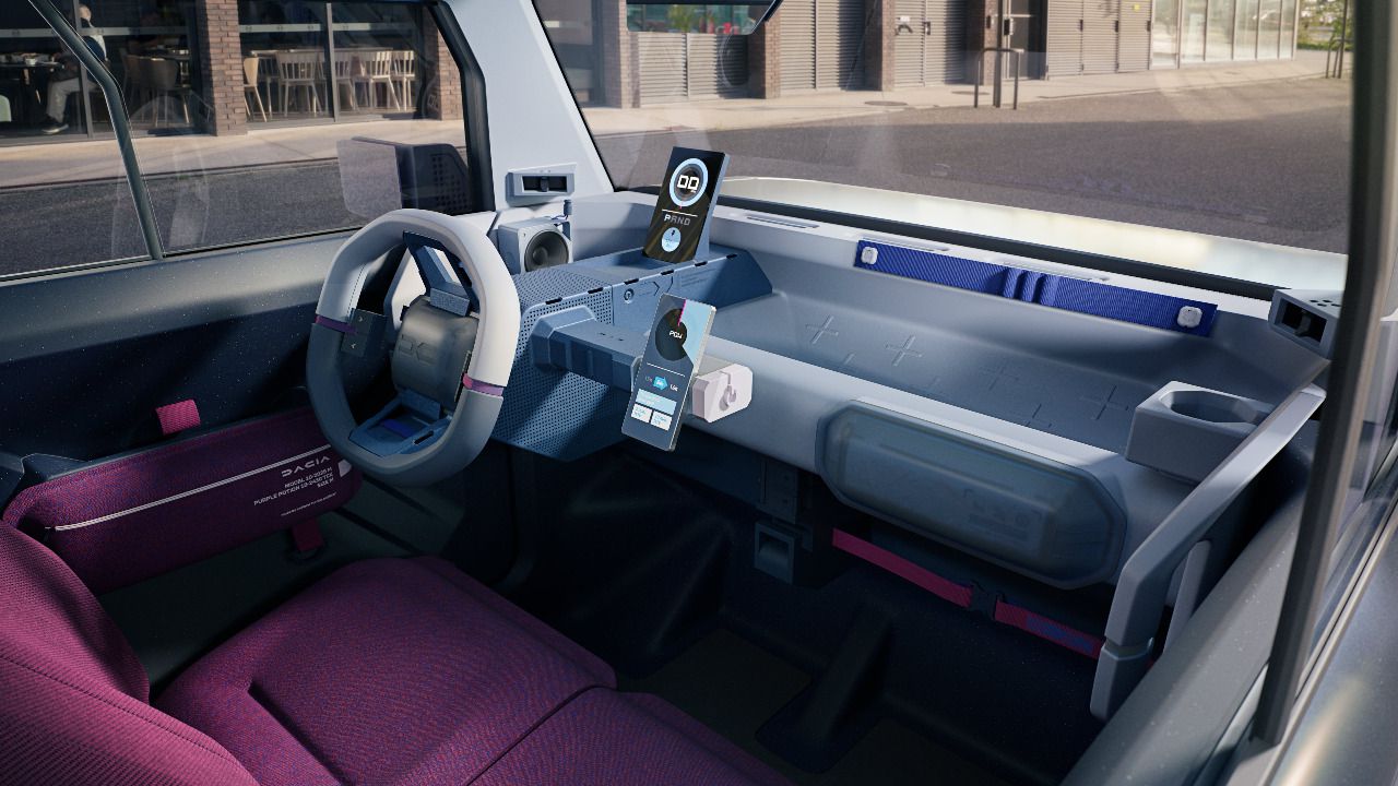 La carrocería está protegida con amplias molduras de Starkle, el material reciclado desarrollado por Dacia, mientras que el tirador de las puertas se sustituye por una correa textil. Ligero, económico y coherente con la filosofía de diseño “sin exceso” que guía al proyecto.
