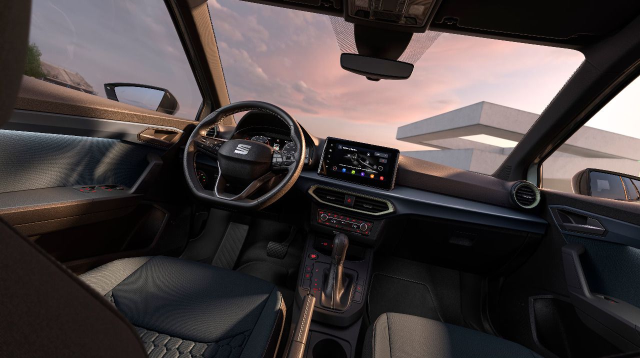 El habitáculo del Arona evoluciona en la misma dirección que el del Ibiza, pero con un enfoque más robusto y tecnológico. El salpicadero adopta el nuevo diseño flotante con pantalla central elevada, que libera espacio y mejora la visibilidad. La integración del sistema Seat Digital Cockpit de 10,25 pulgadas y la conectividad Full Link con Android Auto y Apple CarPlay consolidan un interior más funcional y contemporáneo.