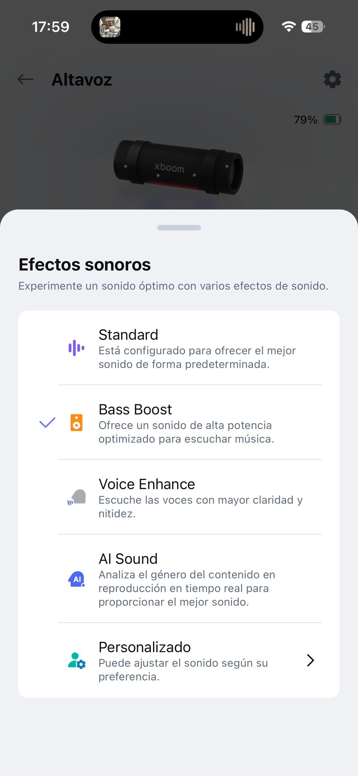 AI Calibration es incluso más útil: calibra el sonido según el espacio donde pongas el altavoz, adaptándose si lo cambias de habitación o lo usas al aire libre. Y AI Lighting sincroniza las luces LED con el ritmo de la música, creando efectos distintos según el estilo o el ambiente. Son funciones que se notan en el día a día, no solo “promesas de IA”.