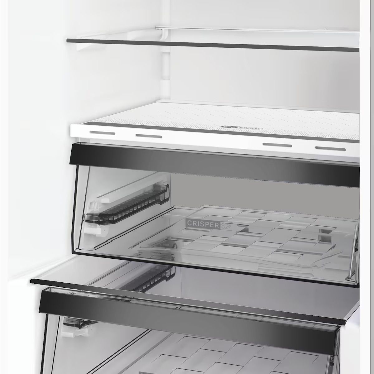 El frigorífico incluye tres estantes de cristal, cajones para frutas y verduras y bandejas en puerta bien distribuidas. La iluminación interior es correcta y homogénea. La organización es clásica y funcional, aunque no especialmente modular.