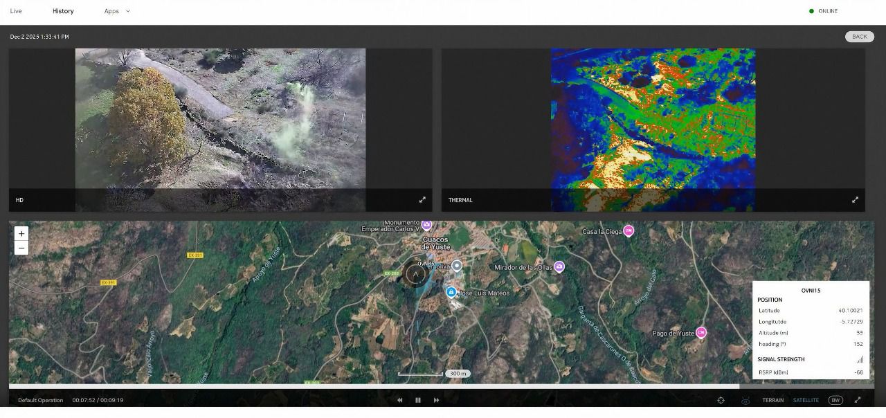 El servicio ya cuenta con aplicaciones concretas en entornos reales. Uno de los primeros proyectos se ha desplegado en Cuacos de Yuste, en colaboración con la Junta de Extremadura, donde se está utilizando un sistema de monitorización y detección temprana de incendios forestales. En este escenario, los drones permanecen en sus estaciones y se activan en remoto ante la detección de focos de calor. En cuestión de minutos, el dispositivo se desplaza hasta la zona afectada y transmite imágenes en tiempo real a los equipos de emergencia, lo que permite evaluar la situación y decidir qué tipo de intervención es la más apropiada.