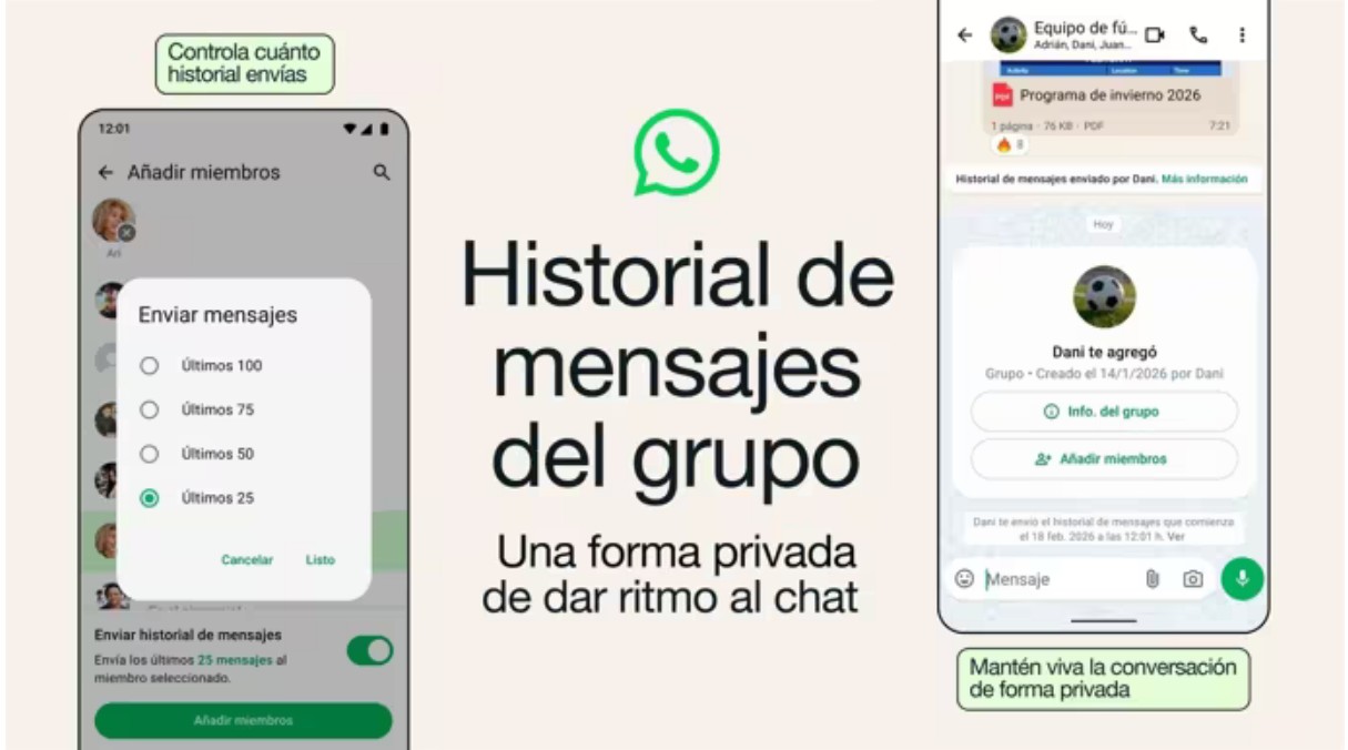 En este sentido, la plataforma introduce una herramienta específica para facilitar la continuidad de las conversaciones sin interrumpir la dinámica del chat. Cuando se añada a una persona a un grupo, los administradores podrán elegir enviarle parte del historial reciente, de forma que disponga del contexto necesario para entender los temas tratados antes de su llegada.