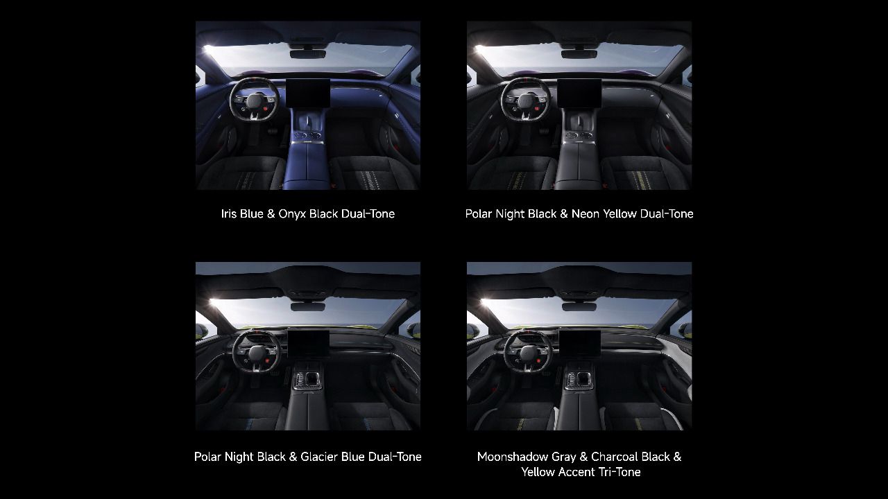 El habitáculo replica la ambición estética con cuatro esquemas poco frecuentes en automoción de serie. Iris Blue & Onyx Black apuesta por Alcantara azul como soporte expresivo, alejándolo del estereotipo “solo rendimiento”. Polar Night Black & Neon Yellow adopta contraste deportivo, con amarillo de alto impacto sobre base sobria.