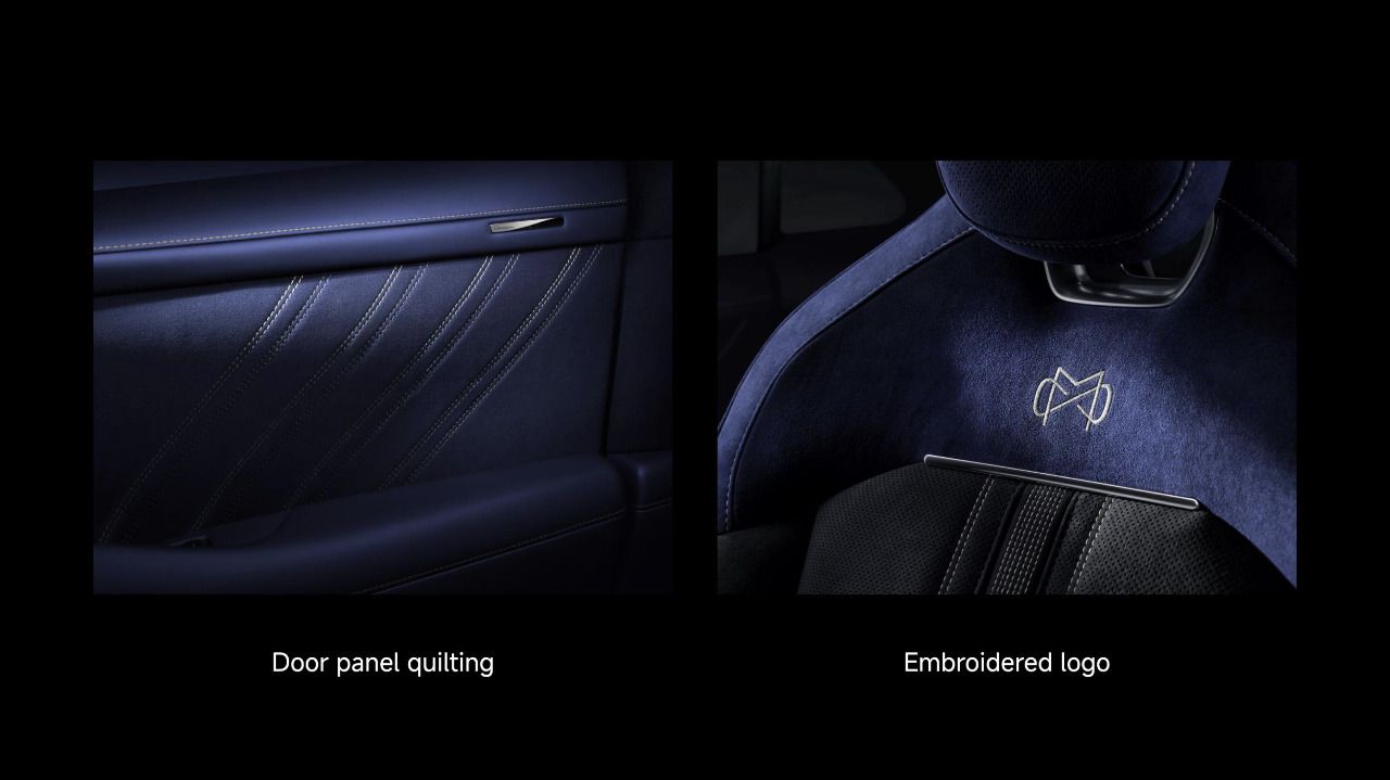 Los asientos introducen acolchado con patrón inspirado en la alta costura y una cinta de pespunte ejecutada con técnica síncrona de siete agujas y paso de 1/8", que se replica en paneles de puerta con tolerancias muy ajustadas. El bordado del logotipo, 1862 puntadas, dibuja el motivo “M + ∞”, síntesis de personalización e identidad.