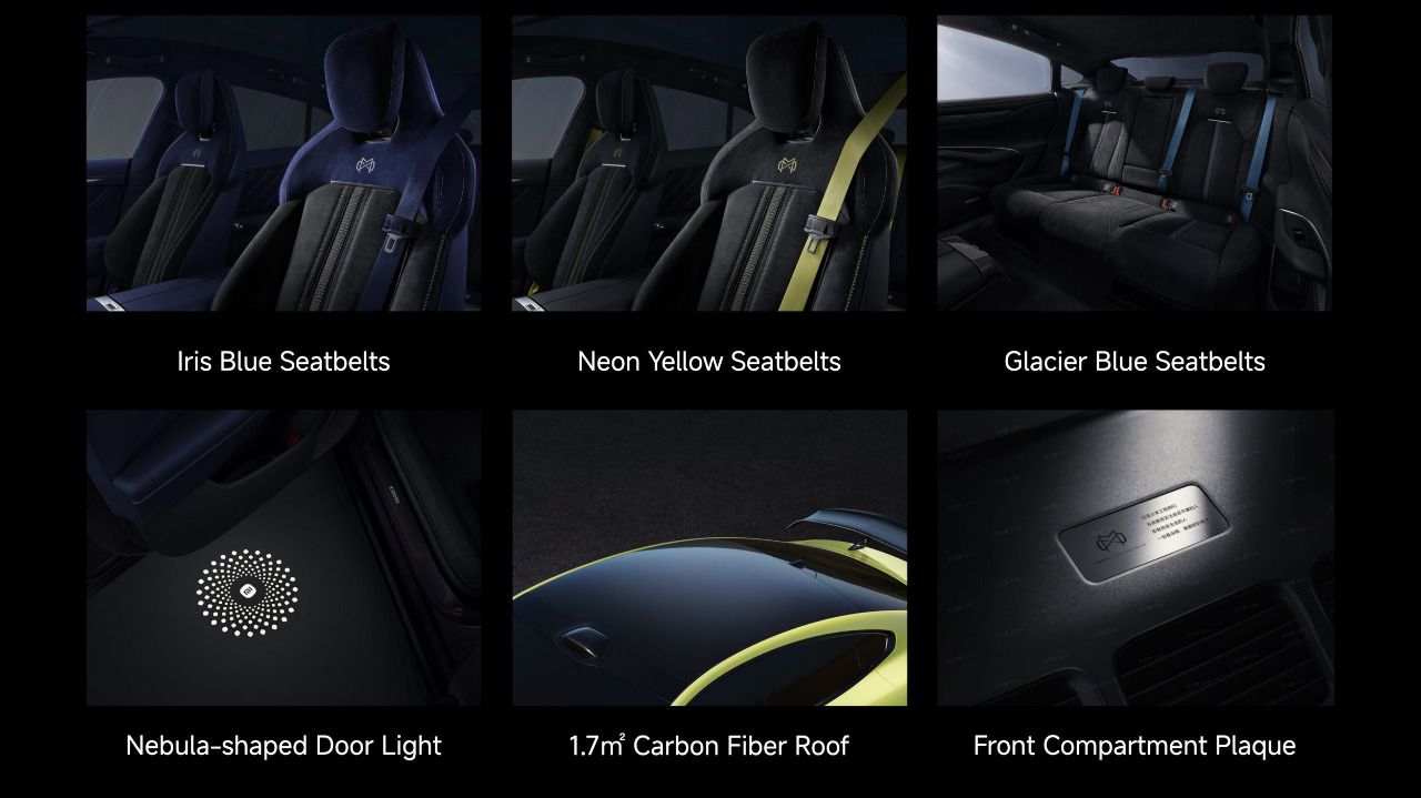 El programa incorpora cinturones en Iris Blue, Neon Yellow y Glacier Blue como acentos cromáticos. La proyección de bienvenida con motivo de nebulosa convierte cada acceso en ritual. El “Classic Bolt Livery”, heredado del prototipo SU7 Ultra, se ofrece en amarillo, azul o negro. Para el SU7 Ultra, el techo de fibra de carbono de 1,7 m² aporta ligereza visual y deportiva. Bajo el capó delantero, una placa específica distingue los vehículos personalizados con un mensaje propio del programa.